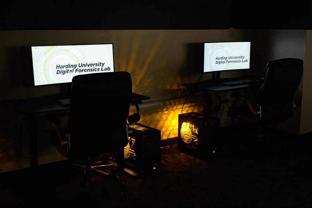 Logo with circuit and tech-inspired design and text: 'Harding University Digital Forensics Lab'